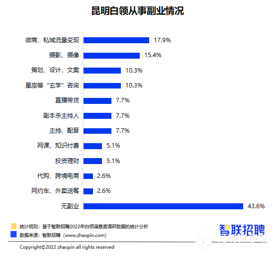 數(shù)據(jù)顯示,2022年僅有30.8%的昆明白領(lǐng)獲得加薪,比2021年的39.6%有所下降。還有41%的受訪白領(lǐng)表示薪資不升反降,這一比例較021年的30.2%增加10.8個百分點。超過半數(shù)的昆明白領(lǐng)開拓了副業(yè),其中,微商、私域流量變現(xiàn)占比為17.9%,攝影、攝像占比為15.4%??偟膩砜?,經(jīng)歷三年的疫情考驗后,昆明白領(lǐng)的存款狀況有所改善,“負債者聯(lián)盟”占比從2021年的47.2%,下降到2022年的46.2%。