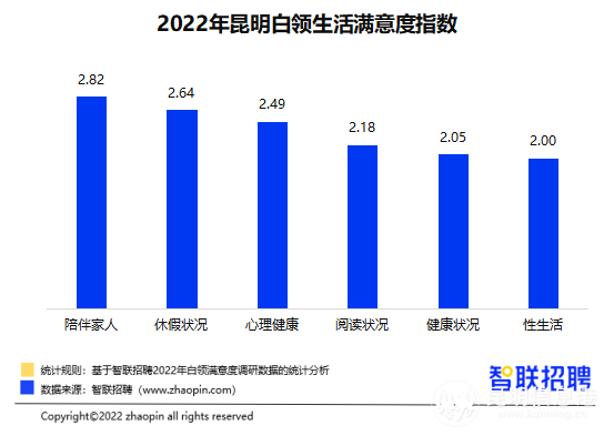 2022年,昆明白領(lǐng)生活滿意度指數(shù)為2.36,與2021年的2.48相比有所下降,全國范圍內(nèi)也是排在第33位,僅高于指數(shù)為2.16的東莞。具體來看,昆明白領(lǐng)對陪伴家人最為滿意,指數(shù)為2.82,其次是休假狀況(2.64),排在第三的為心理健康(2.49)。