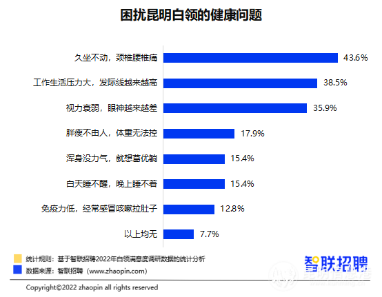 43.6%的昆明白領(lǐng)表示受到頸椎腰椎痛困擾,此外,發(fā)際線升高(38.5%)、視力衰弱(35.9%)也較為普遍。在改善健康的習(xí)慣上,30.8%的昆明白領(lǐng)選擇健康飲食,占比最高。堅持早起早睡和佛系養(yǎng)生的白領(lǐng),占比均為28.2%。