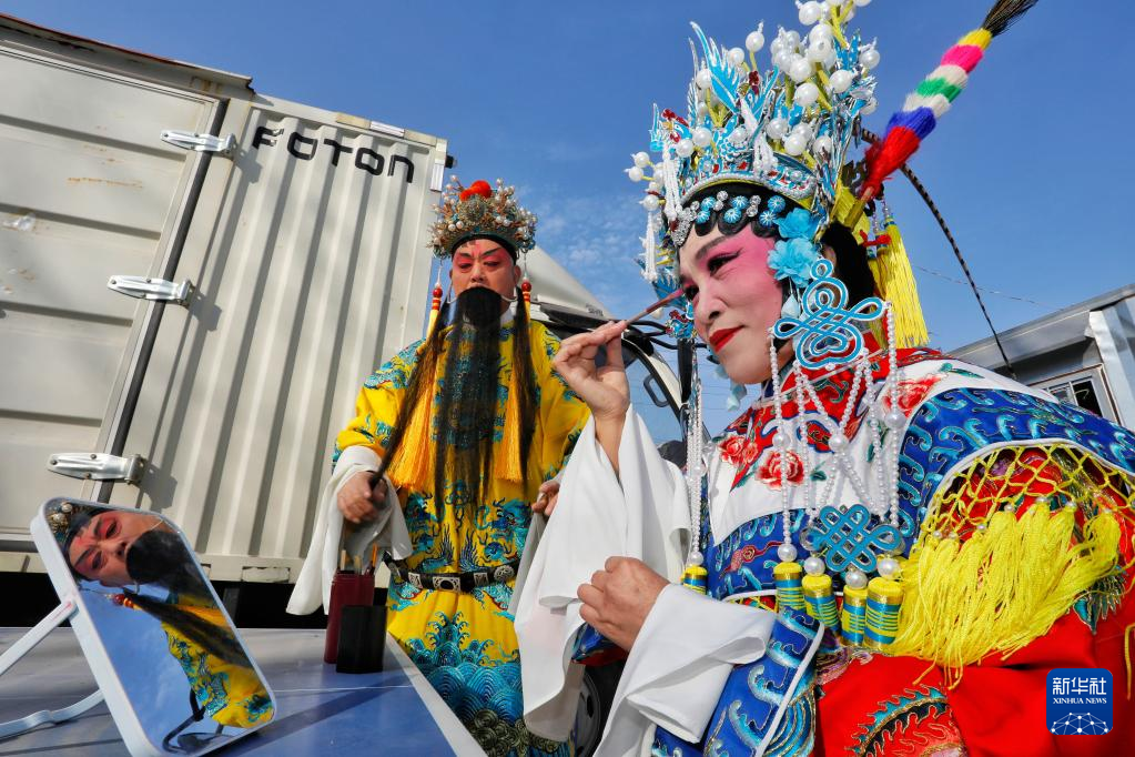 1月10號,在羊流鎮(zhèn)大洼村,戲曲演員準(zhǔn)備表演豫劇曲目。新華社發(fā)(陳陽/攝)