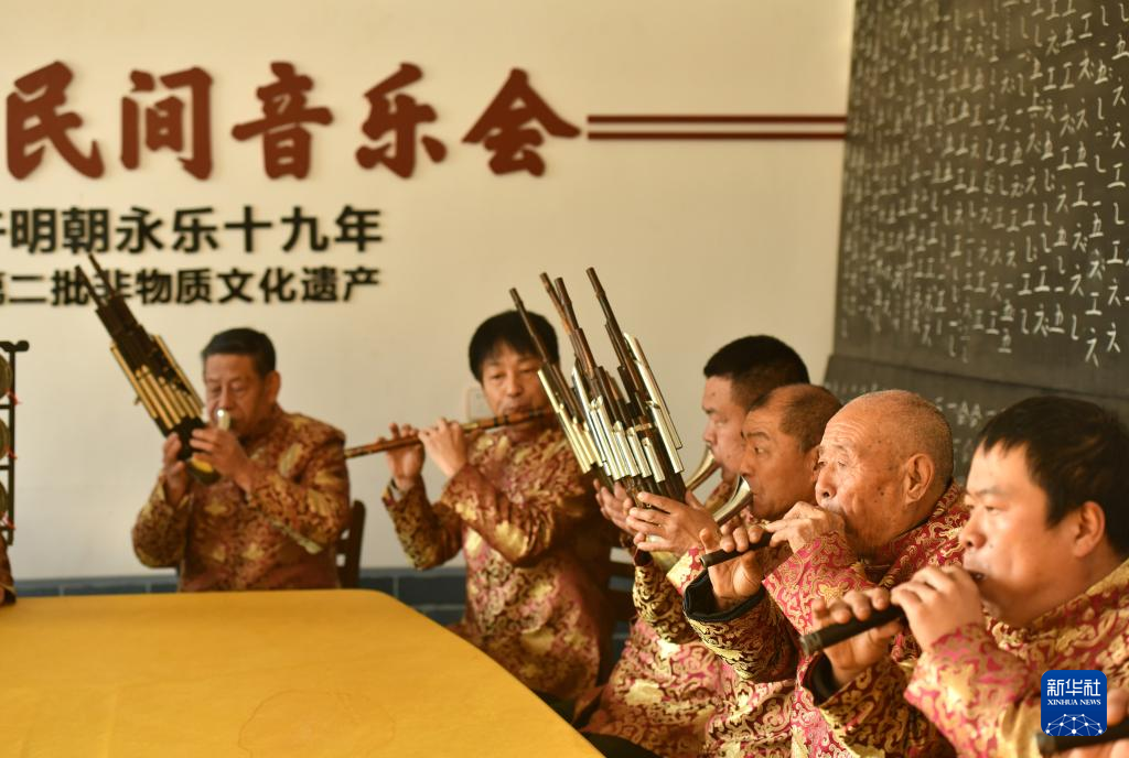 1月10日,在任丘市梁召鎮(zhèn)辛安莊村文化活動(dòng)室里,民間藝人在辛安莊民間音樂會(huì)排練中吹奏《淘金令》曲目。新華社發(fā)(苑立偉/攝)