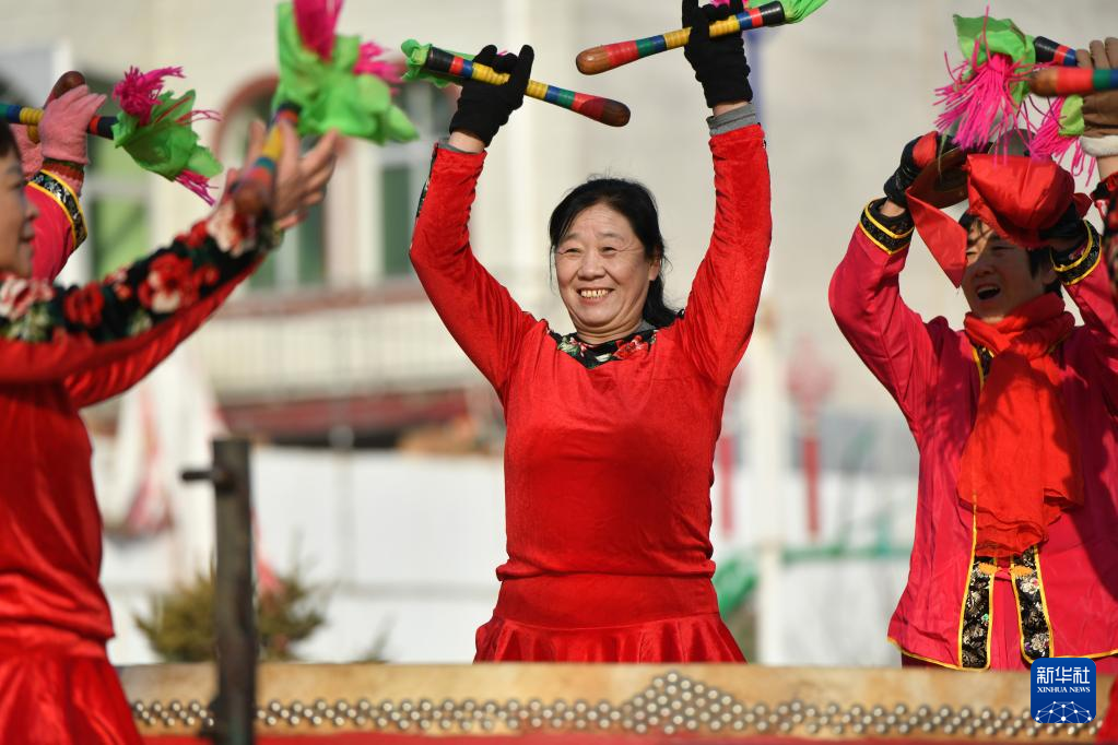 1月10日,在任丘市梁召鎮(zhèn)辛安莊村文化廣場(chǎng),鼓手在排練河北省級(jí)非遺項(xiàng)目任丘大鼓。新華社發(fā)(苑立偉/攝)