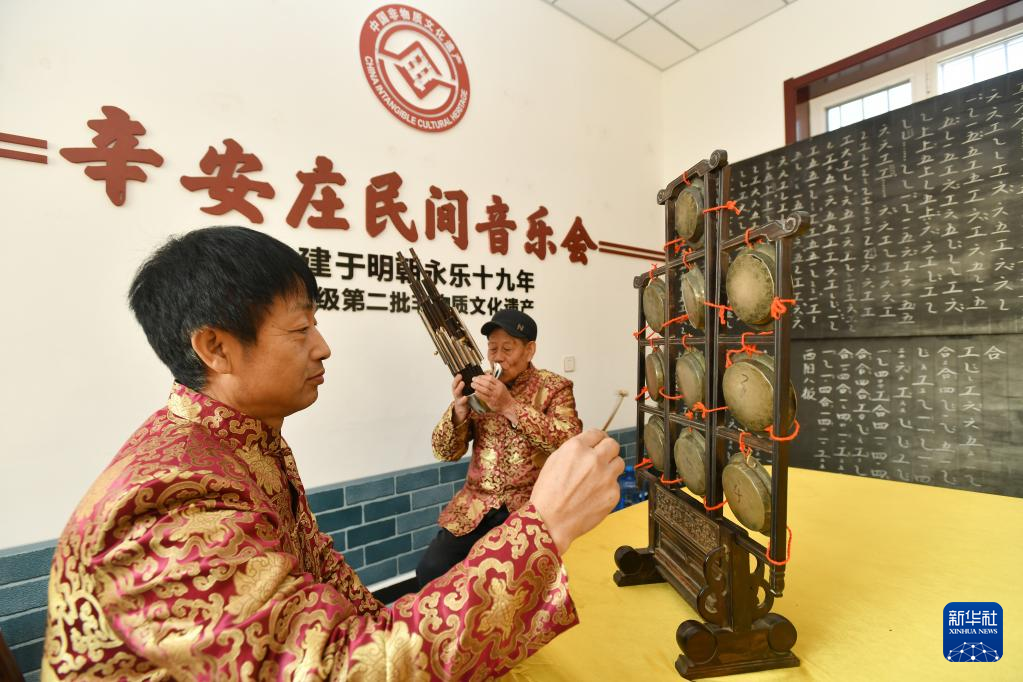 1月10日,在任丘市梁召鎮(zhèn)辛安莊村文化活動(dòng)室里,民間藝人(前)在辛安莊民間音樂會(huì)排練中使用云鑼演奏。新華社發(fā)(苑立偉/攝)