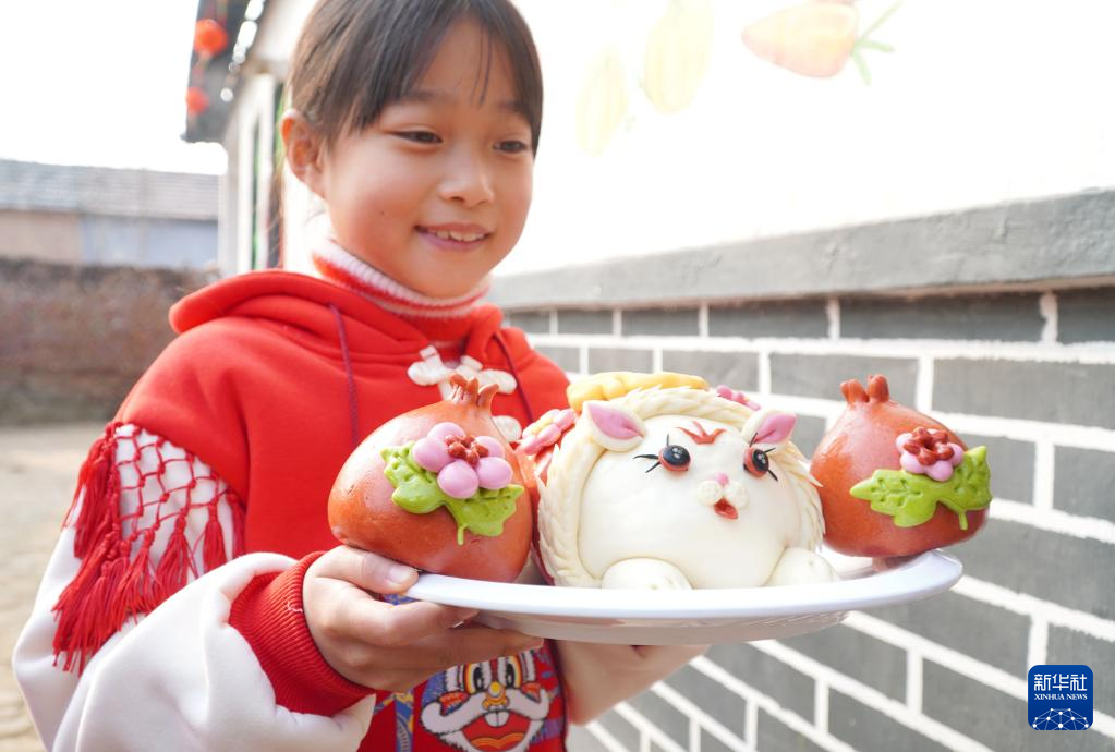 1月11日,在山東省鄆城縣玉皇廟鎮(zhèn)韓莊村,一名小朋友端著兔子造型花饃。新華社記者徐速繪/攝