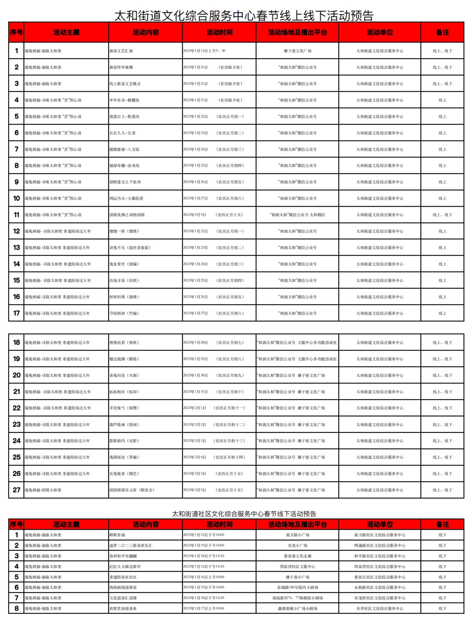 在場群眾紛紛表示:本次活動豐富了大家的文娛生活,對于即將到來的2023年也更加期待了。春節(jié)期間,太和街道文化綜合服務(wù)中心還將推出“福臨太和里”新春文藝匯演、“尋味太和里”傳統(tǒng)美食教學(xué)、“尋韻太和里”非遺陪你過大年和“團(tuán)圓太和里”元宵聯(lián)歡會四個系列三十五場活動,弘揚(yáng)優(yōu)秀傳統(tǒng)文化,增強(qiáng)轄區(qū)群眾的文化認(rèn)同感與生活幸福指數(shù)。