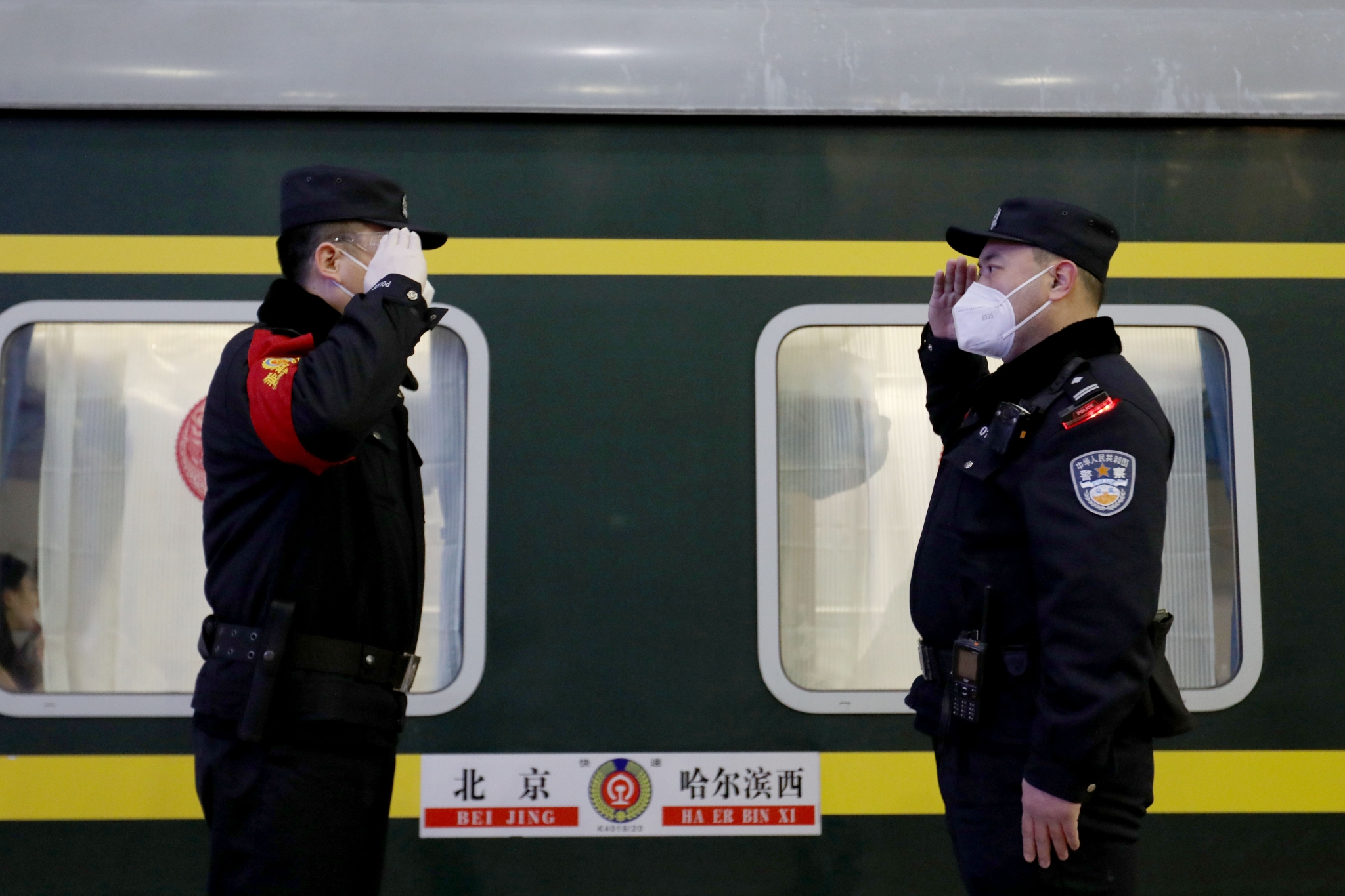 17時(shí)20分,旅客檢票進(jìn)站,列車車門打開,站臺(tái)上瞬間“熱鬧”起來,在貼著喜慶窗花的車窗前,旅客們紛紛合影留念,在站臺(tái)反復(fù)巡視的民警王卓林見到有提著大包小包行李的旅客,小跑著上前幫忙將旅客送上車廂。隨后,王卓林和天津鐵路公安處乘警支隊(duì)四大隊(duì)大隊(duì)長張棕鵬相互敬禮,完成站車交接。
