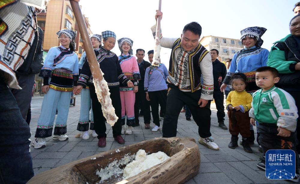↑1月13日,當(dāng)?shù)厝罕娫诹_甸縣木引鎮(zhèn)康夢家園參與打糍粑活動。新華社記者 楊楹 攝