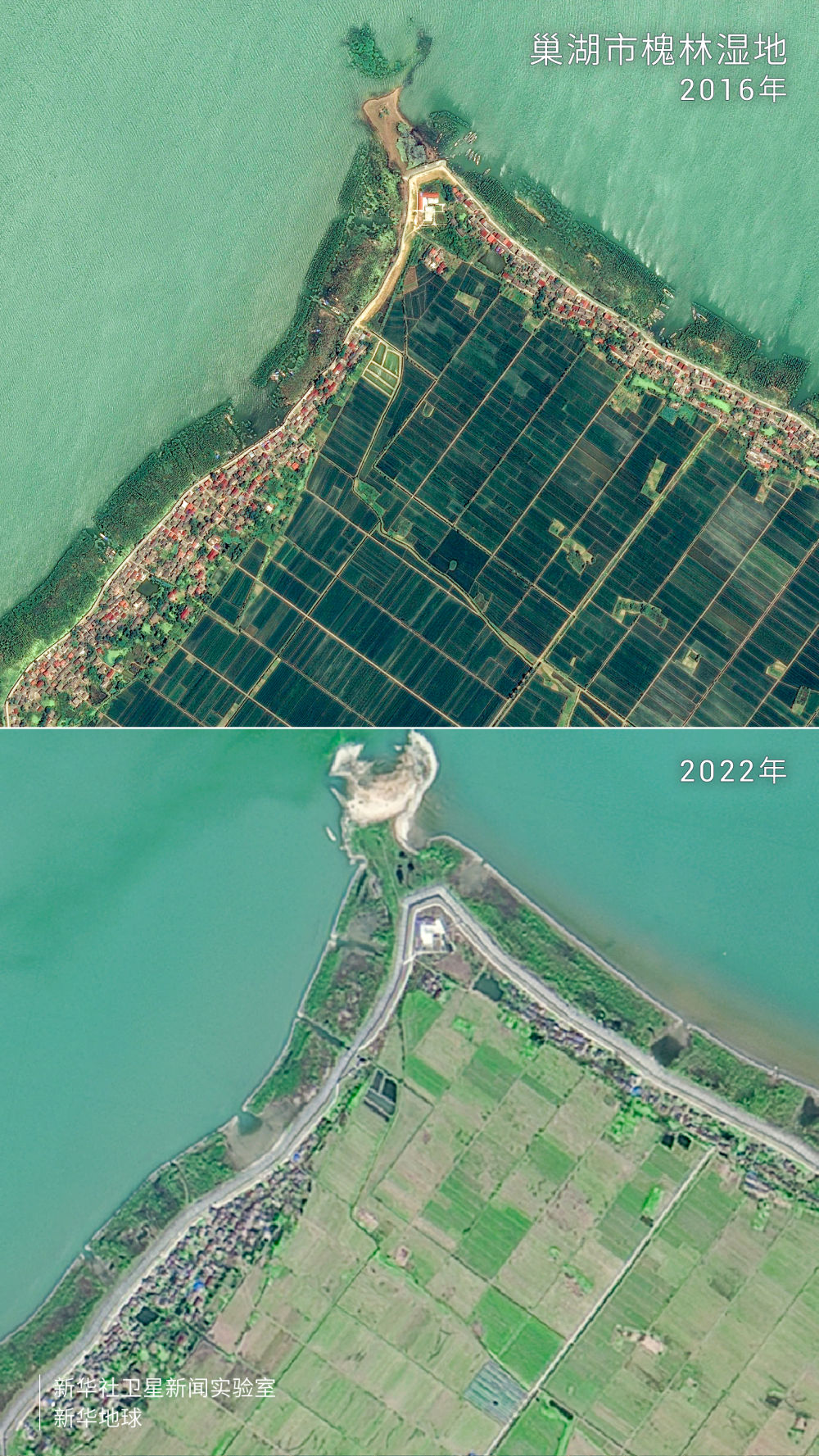圖為巢湖槐林濕地對比圖。圖上可見,2016年巢湖岸線仍有漁船???,2022年這里已無漁船。