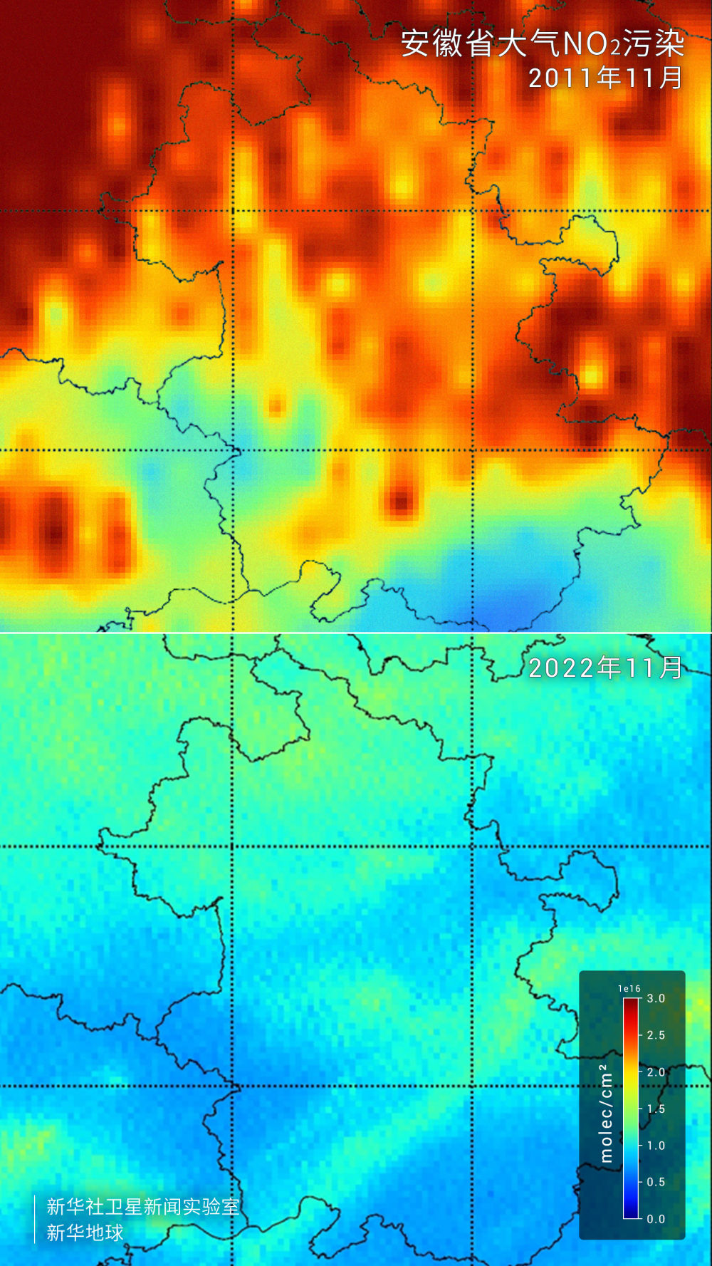 圖為安徽省2011年和2022年大氣二氧化氮污染分布圖前后對比,圖像顯示污染明顯好轉(zhuǎn)。(中科院合肥物質(zhì)科學(xué)研究院安徽光學(xué)精密機(jī)械研究所供圖)