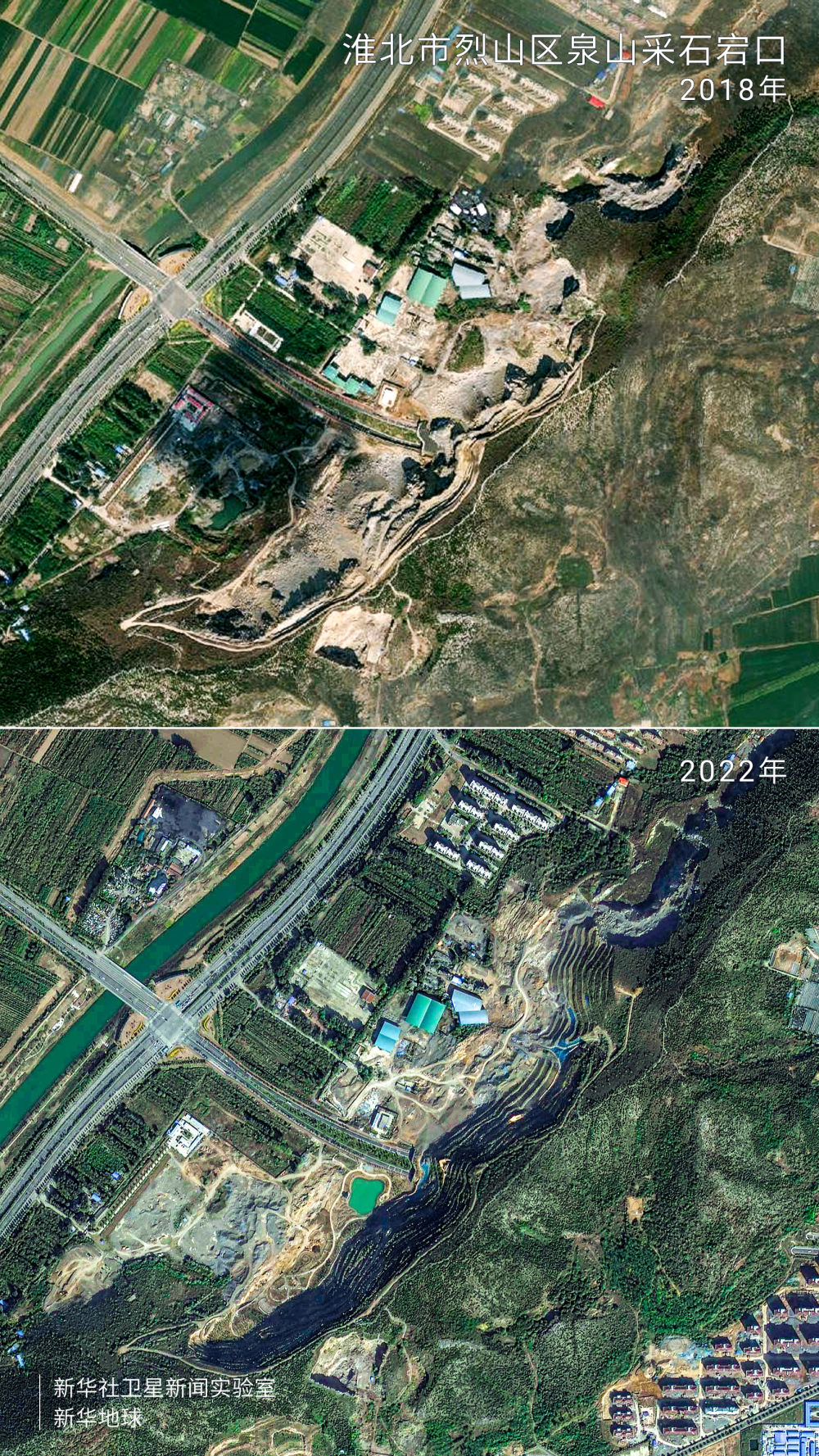 圖為淮北市烈山區(qū)泉山采石宕口2018年和2022年復(fù)綠前后對比圖。(新華社衛(wèi)星新聞實驗室制作)