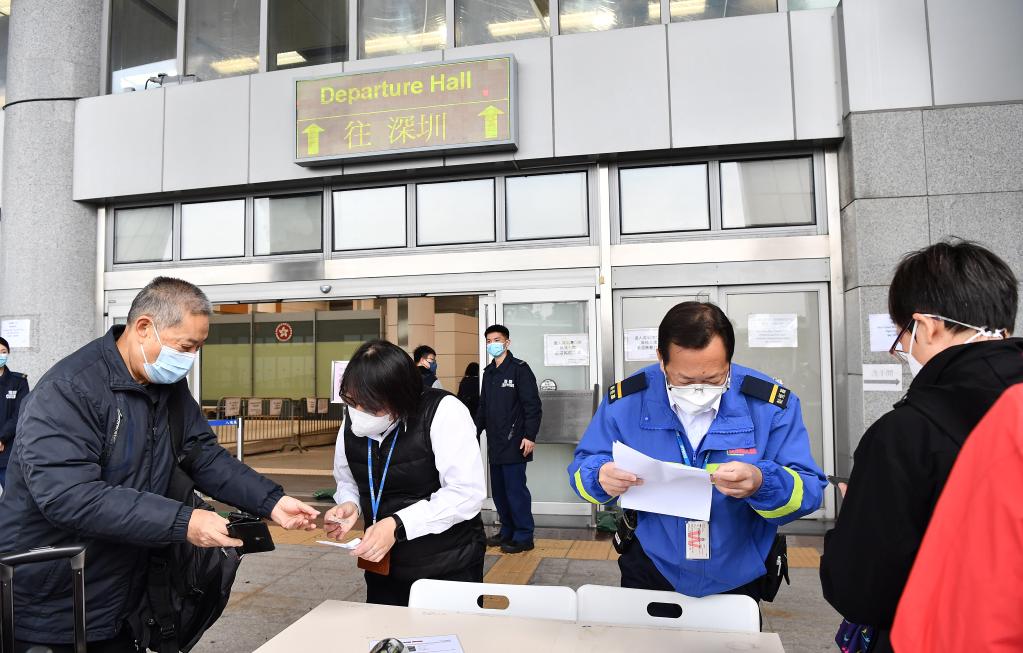 1月8日,香港工作人員在深圳灣口岸查驗旅客過關(guān)手續(xù)資料。新華社記者 陳鐸/攝