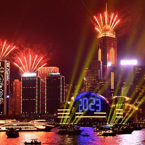 1月1日,香港維多利亞港上演“幻彩詠香江”加強版煙火光影匯演,迎接2023年的到來。新華社記者 陳鐸/攝