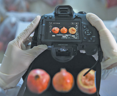 安徽農(nóng)業(yè)科學(xué)院園藝研究所石榴創(chuàng)新團隊成員在給石榴拍照。近年來,該團隊聚焦產(chǎn)業(yè)需求,創(chuàng)新育種技術(shù),培育出鮮食、加工、觀賞等不同系列的石榴種質(zhì)資源,為鄉(xiāng)村振興貢獻(xiàn)科研力量。