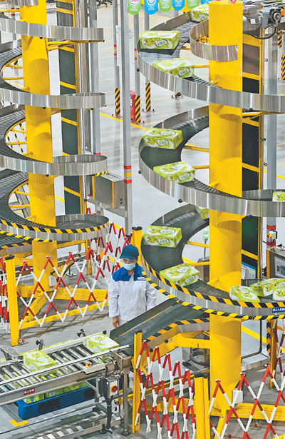 陜西咸陽市清河食品工業(yè)園區(qū),一家乳業(yè)公司的生產(chǎn)車間內(nèi),自動化生產(chǎn)線正在對乳制品進(jìn)行打包作業(yè)。