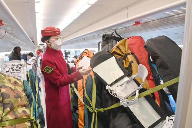 京張高鐵D6715次列車上,列車長正在檢查滑雪用具的固定情況。(受訪者供圖)