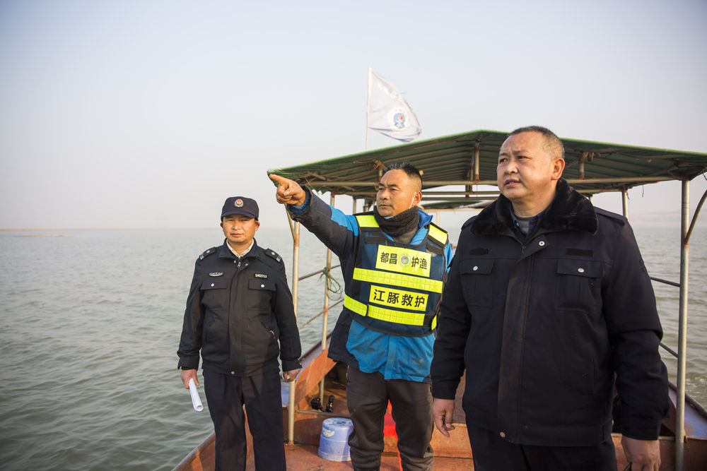 占柏山(左二)和都昌縣漁政執(zhí)法大隊(duì)執(zhí)法人員在鄱陽湖都昌水域巡護(hù)江豚。新華社記者余剛 攝