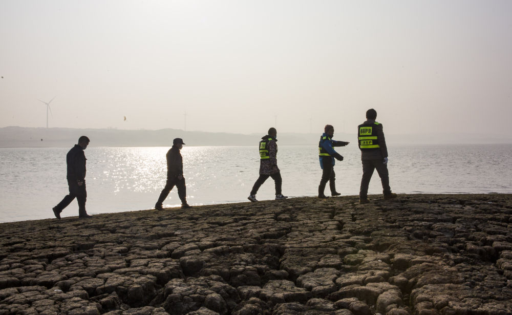 占柏山(右二)和都昌縣漁政執(zhí)法大隊(duì)執(zhí)法人員沿著龜裂的沙洲徒步巡查。新華社記者余剛 攝