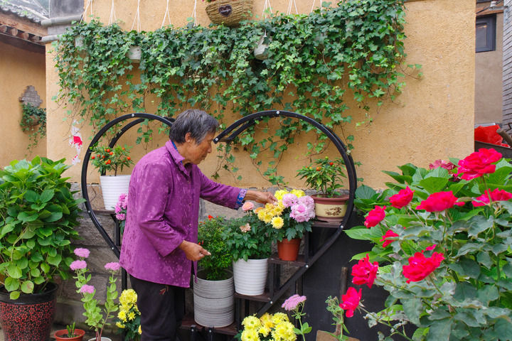 2020年8月30日,在河北省阜平縣駱駝灣村,村民唐宗秀在打理院子里的花草。新華社發(fā)(李玉亮/攝)