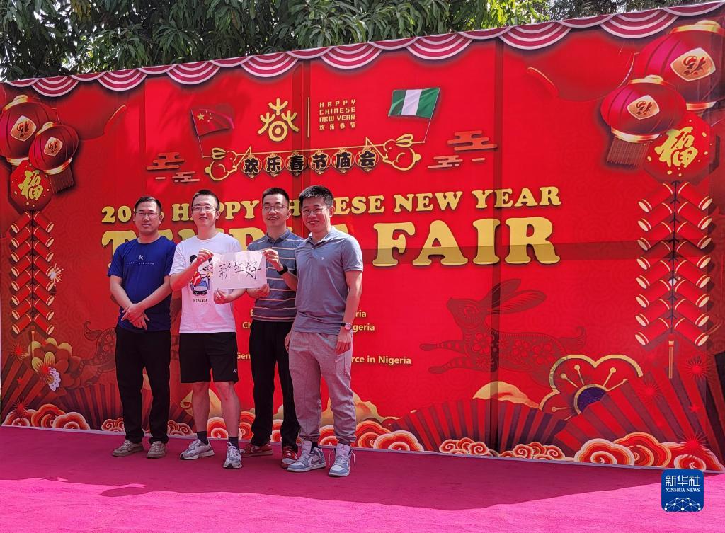 1月14日,在尼日利亞阿布賈,人們?cè)凇皻g樂春節(jié)”廟會(huì)活動(dòng)上合影留念。新華社記者 郭駿/攝