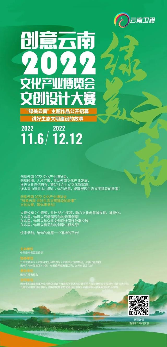創(chuàng)意云南 2022 文化產(chǎn)業(yè)博覽會文創(chuàng)設(shè)計大賽以“綠美云南”和“傳承紅色記憶 講好五個故事”為主題,面向社會征集優(yōu)秀文創(chuàng)作品,旨在做好云南省紅色文化傳承發(fā)展,展現(xiàn)云南省生態(tài)文明建設(shè)成果。大賽由中共云南省委宣傳部主辦;由云南省商務(wù)廳、云南省文化和旅游廳、云南報業(yè)傳媒集團、云南出版集團、云南廣電傳媒集團、中國廣電云南網(wǎng)絡(luò)有限公司、各州市委宣傳部協(xié)辦;由云南廣播電視臺承辦。
