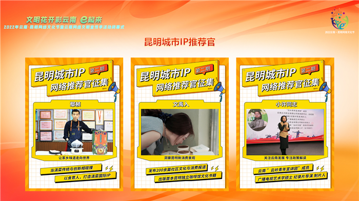 2022年新推的“昆明城市IP網(wǎng)絡(luò)推薦官”活動,面向全社會征集熱愛昆明、了解昆明的社會名人、大V、網(wǎng)絡(luò)達人,推介自己的家鄉(xiāng),展示昆明的“美貌”和“才華”,在網(wǎng)絡(luò)空間凝聚起奮進新征程、建功新時代的磅礴力量。征集活動開展以來,共評選出20名IP網(wǎng)絡(luò)推薦官。他們來自社會各行各業(yè),有金融行業(yè)、美食餐飲等行業(yè)工作者,有探店博主、插畫師等自由從業(yè)者,也有專業(yè)從事研究昆明歷史文化、消費市場的學(xué)者。這里面有70歲推動昆明紅色文化傳承發(fā)展的關(guān)保昌,有多位60歲老奶奶組成的時尚群體,還有一批00后年輕電競選手……他們用自己的方式,影響著身邊的人,讓昆明的美好能夠被更多人看見。