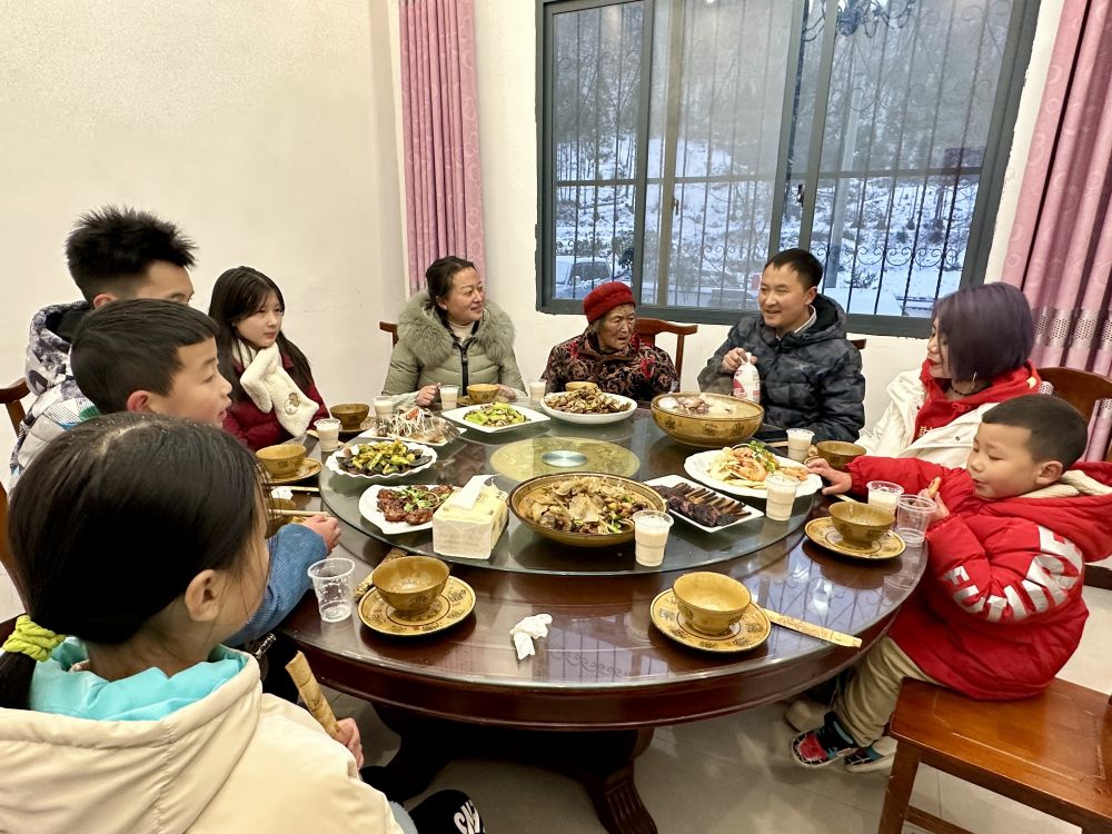 從農(nóng)家自制的臘肉、土雞、松花蛋,到外面買來的大蝦、蟶子,滿滿一桌食材不一會兒就變成滿滿一桌菜肴。招呼一聲在外面打雪仗、堆雪人的孩子們,唐代軍先扶奶奶上主座,接著媳婦和弟弟妹妹上桌,最后進屋的是5個成了“白頭翁”的小輩人。