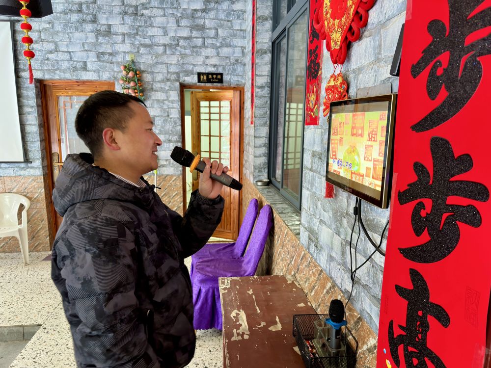 家宴結(jié)束,天色漸暗,唐代軍打開了院里游客喜歡用的卡拉OK機開心地“吼了幾嗓子”。音樂伴奏下,孩子們抱來了一大盒的花炮。一個個直沖天際的小禮花,點亮了被白雪覆蓋的山鄉(xiāng)的夜空。