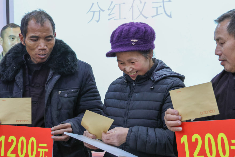 2023年1月11日,貴州省麻江縣龍山鎮(zhèn)河壩村舉辦蜂蜜加工產(chǎn)業(yè)扶貧項目分紅儀式,村民領(lǐng)取到1200元產(chǎn)業(yè)分紅金。新華社記者趙昭 攝