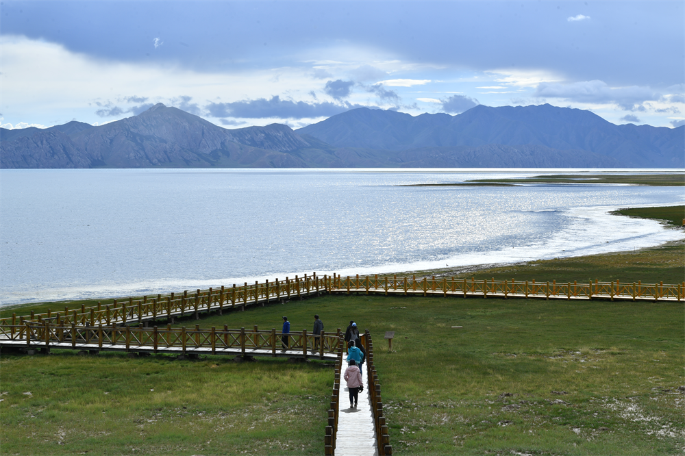 游客行走在青海省果洛藏族自治州瑪多縣冬格措納湖岸畔的木棧道上(2022年8月14日)。新華社發(fā)(卡婭梅朵/攝)