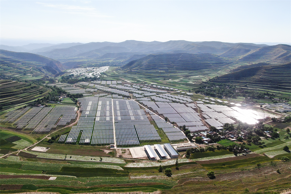 這是2022年6月15日在甘肅省定西市通渭縣榜羅鎮(zhèn)四新村拍攝的集中式光伏電站(無人機照片)。新華社記者 馬希平/攝
