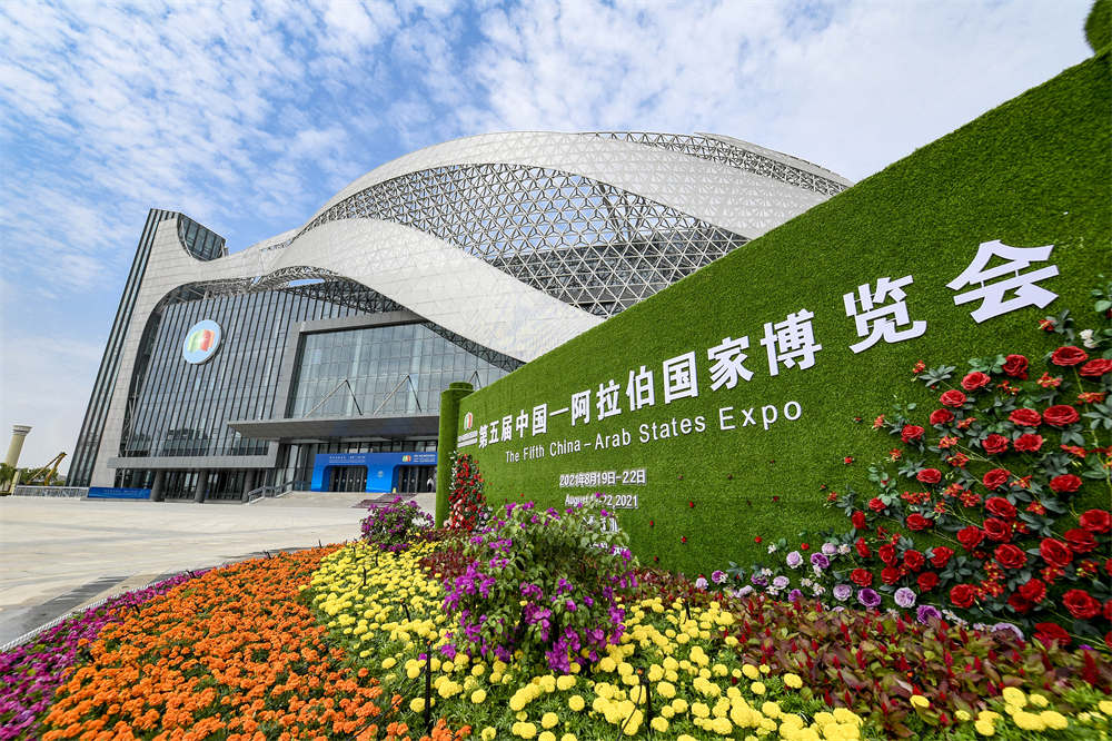 這是2021年8月18日拍攝的第五屆中國-阿拉伯國家博覽會開幕大會會址——寧夏國際會堂外景。新華社記者 馮開華/攝