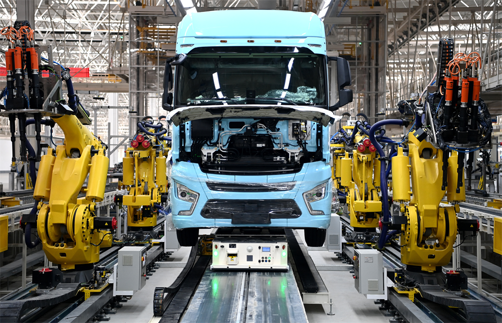 在陜汽重卡擴能項目現(xiàn)場,一輛重卡在汽車總裝生產(chǎn)線輪胎自動化裝配擰緊無人工作站進行裝配(2022年9月27日攝)。新華社記者 劉瀟/攝