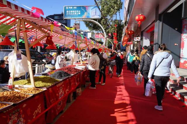 除超市外,陸良縣部分街道相繼推出年貨節(jié)活動,在一個個攤位前,有種類繁多的水果、香氣撲鼻的堅果、新鮮豐富的菜品,商品琳瑯滿目,群眾爭先上街趕集購買年貨,街頭巷尾一片熱鬧,年味十足。