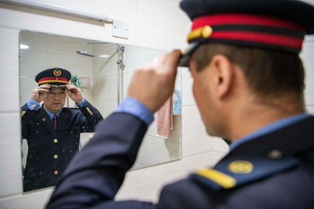 在拉薩機輛整備中心的宿舍里,黃起崗整理自己的著裝(1月11日攝)。
