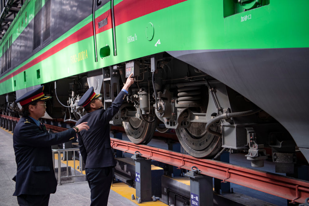 在拉薩機輛整備中心,黃起崗(右)和同事對動車組進行走行部檢查(1月11日攝)。