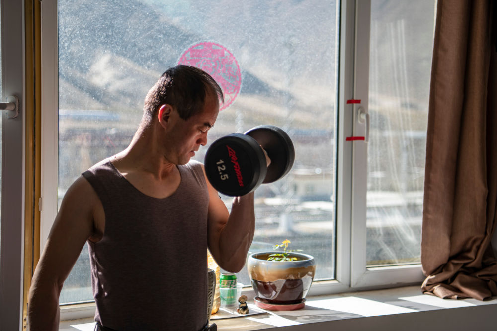 在拉薩機輛整備中心的宿舍里,黃起崗利用空閑時間鍛煉身體(1月11日攝)。
