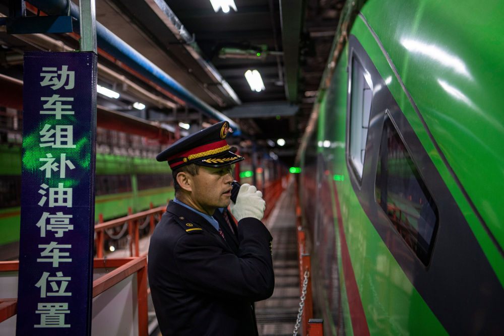 在拉薩機輛整備中心,黃起崗在和一體化調(diào)度中心確認動車組補油位置(1月11日攝)。