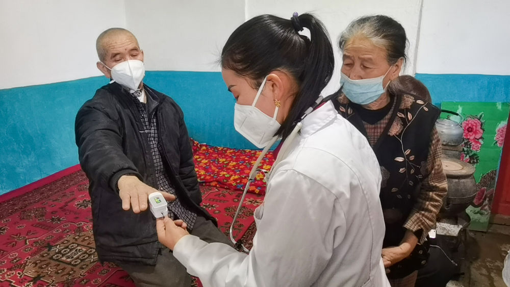 “今天感覺(jué)怎么樣,有沒(méi)有按時(shí)服藥?”庫(kù)瓦那木熟練地將指夾式脈搏血氧儀夾在老人手指上,幫他測(cè)量血氧飽和度,詢問(wèn)身體狀況。