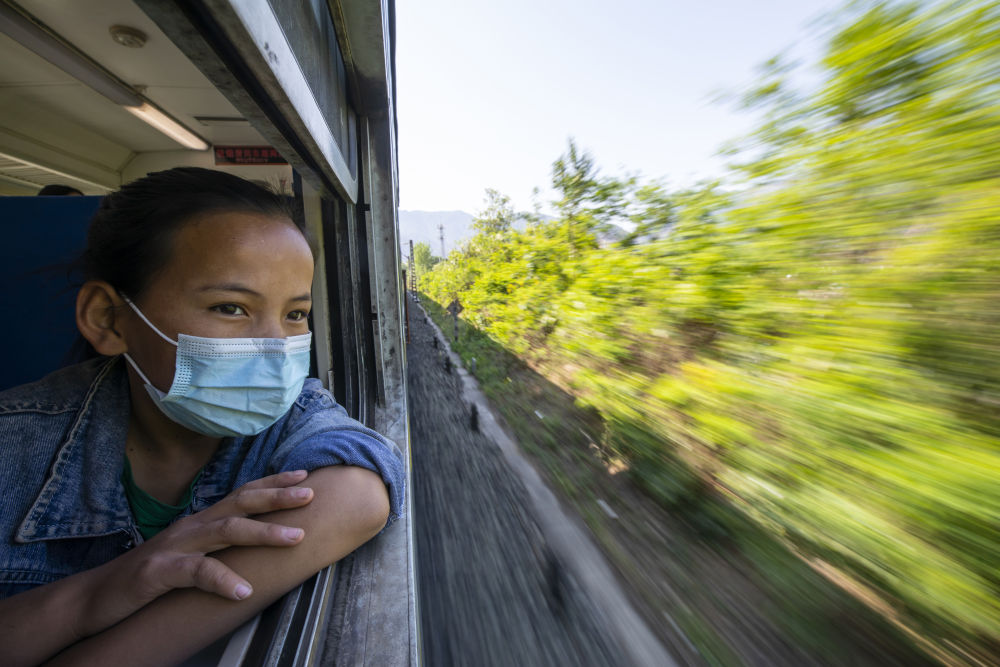↑2021年4月11日,在乘坐5633次列車從家返校途中,一名學(xué)生望著窗外的風(fēng)景。平均時速不到40公里的5633/5634次列車,從普雄到攀枝花南全程共行駛11小時4分鐘,沿途停靠26個站。新華社記者 沈伯韓/攝