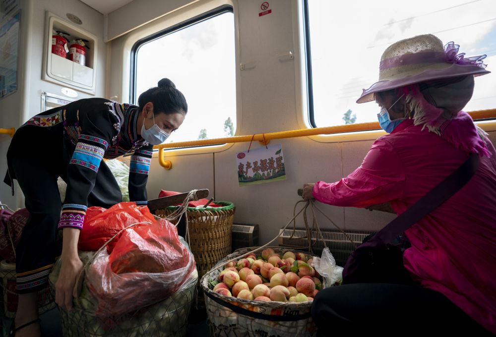 ↑2022年6月2日,5652次列車上一名志愿者(左)幫助一名菜農(nóng)擺放農(nóng)產(chǎn)品。云南昆明至紅果的5652/1次列車目前單程運(yùn)行261公里,沿途逢站必停,票價最高36.5元,最低4元。新華社記者 陳欣波/攝
