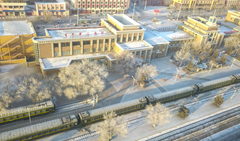 ↑2020年1月9日,6856次列車在二連浩特火車站??浚o人機(jī)照片)。運(yùn)行在內(nèi)蒙古草原深處的6856次列車連接二連浩特與呼和浩特,全程491公里,沿途經(jīng)停28個車站,運(yùn)行時間8個多小時,被廣大農(nóng)牧民親切稱為草原“慢火車”。 新華社記者 彭源/攝