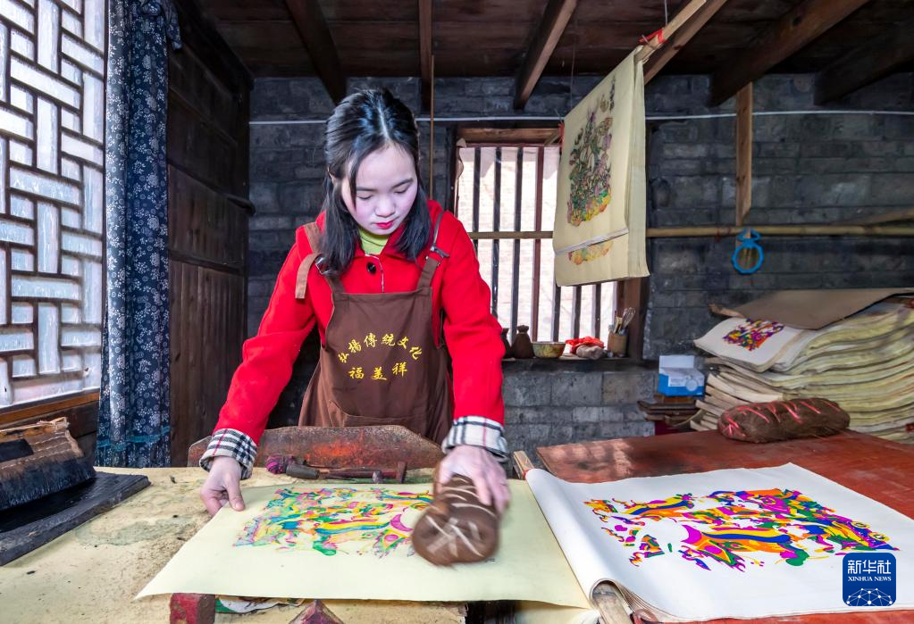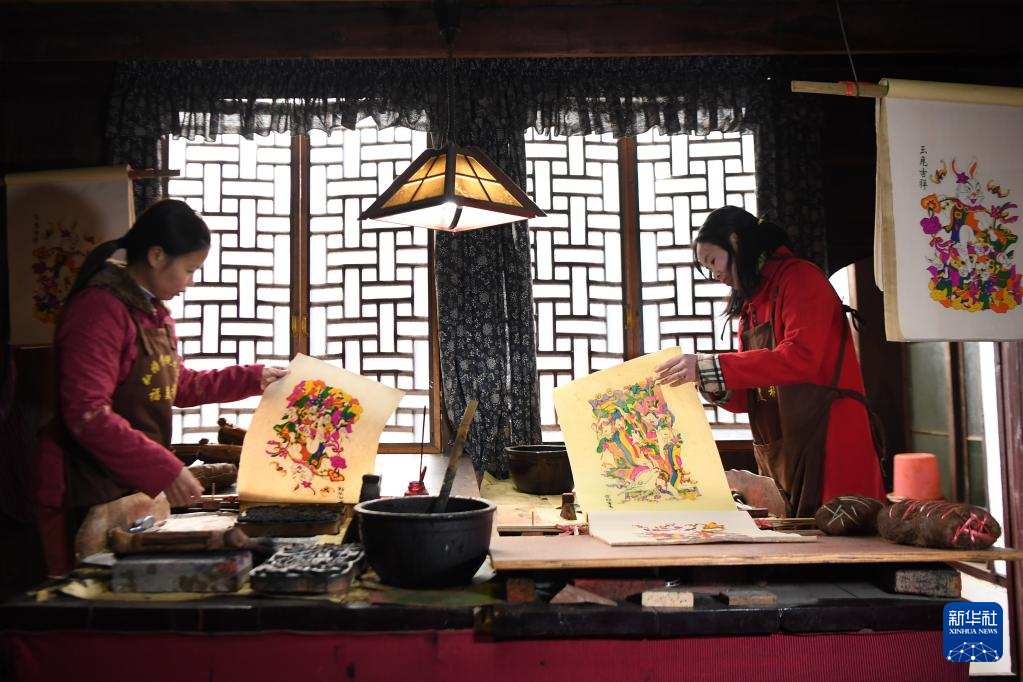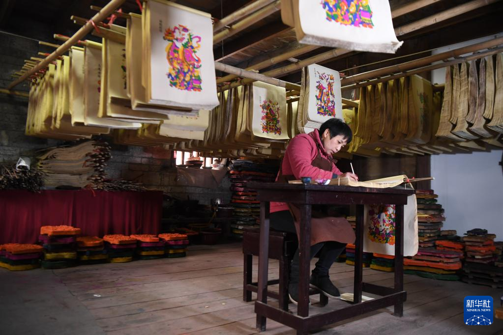 春節(jié)臨近,湖南省邵陽市隆回縣灘頭鎮(zhèn)的木版年畫作坊加班加點趕制年畫,供應(yīng)春節(jié)市場。
