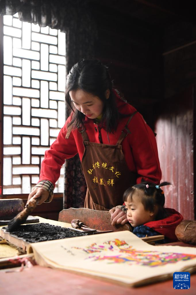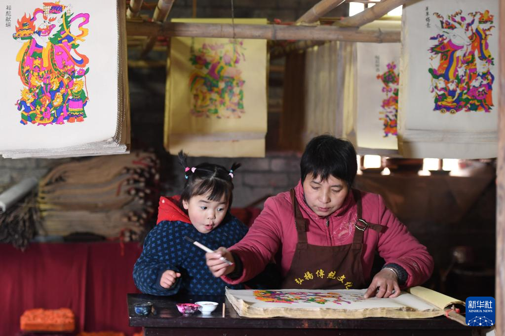 1月17日,在灘頭鎮(zhèn)福美祥年畫作坊,年畫藝人尹冬香在年畫上加入手繪,她的孫女在一旁觀看。