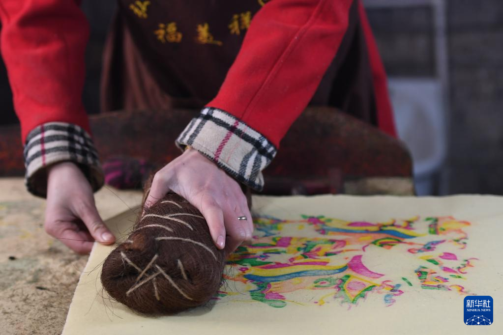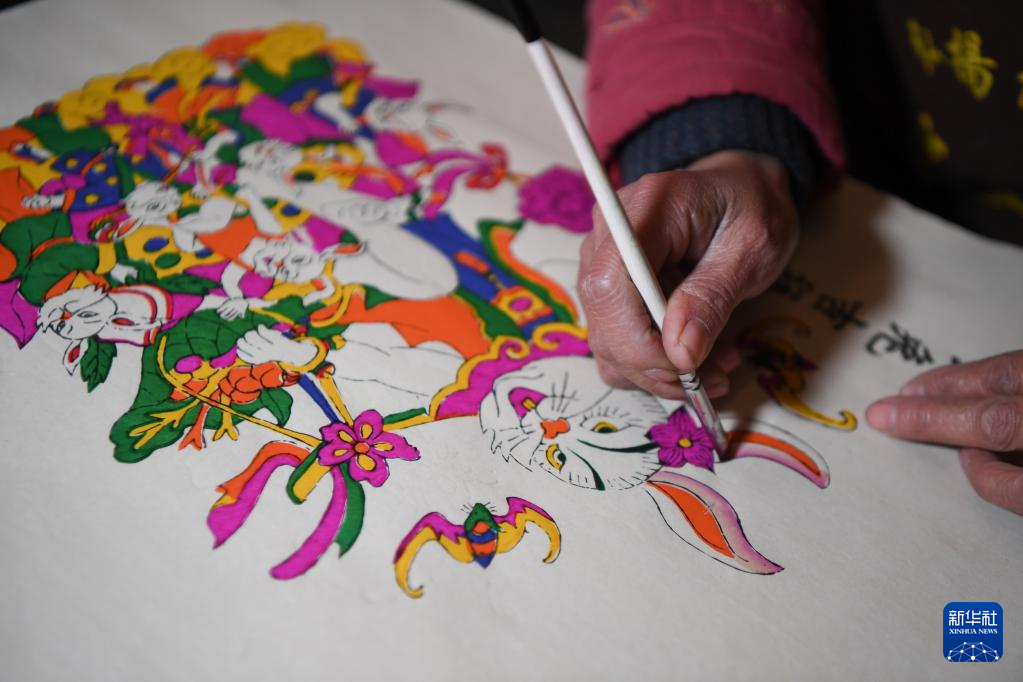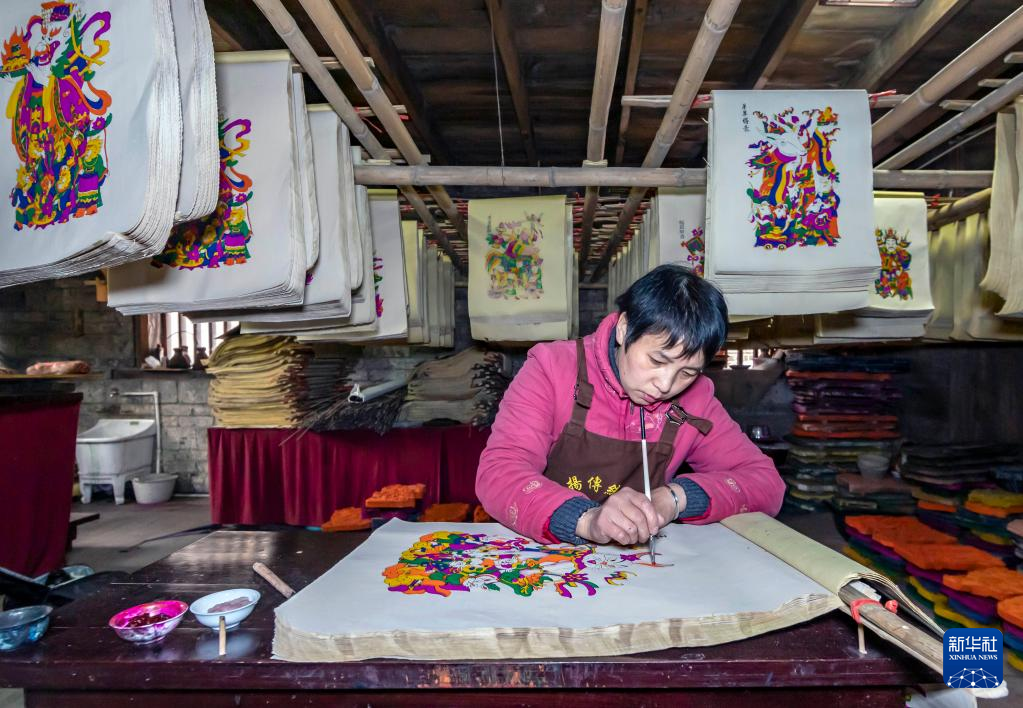 1月17日,在灘頭鎮(zhèn)福美祥年畫作坊,年畫藝人尹冬香在年畫上加入手繪使年畫更加靈動。