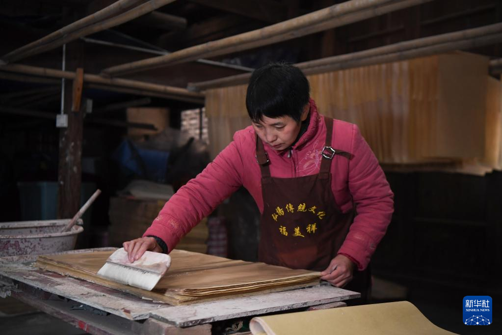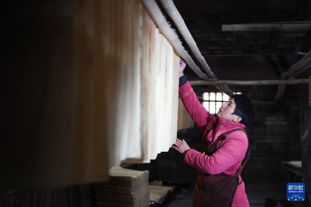 1月17日,在灘頭鎮(zhèn)福美祥年畫作坊,年畫藝人尹冬香在晾紙。