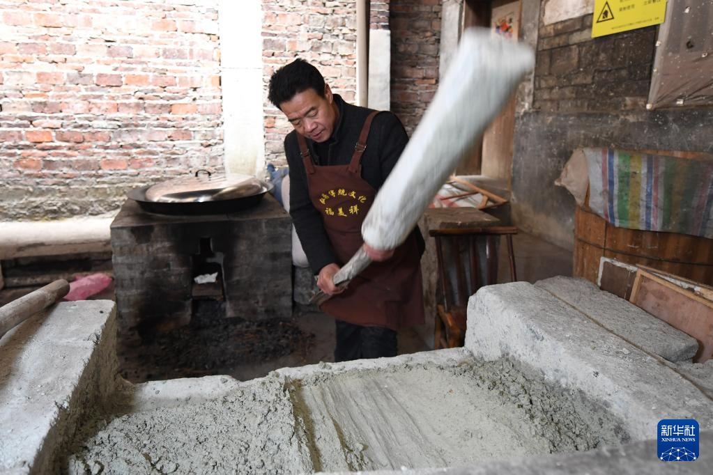 1月17日,在灘頭鎮(zhèn)福美祥年畫作坊,年畫藝人尹冬香將天應(yīng)石加工成的漿刷在紙上,這道工序能使年畫上色更加艷麗。
