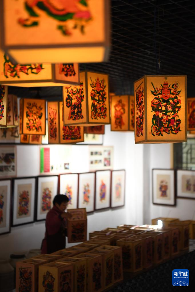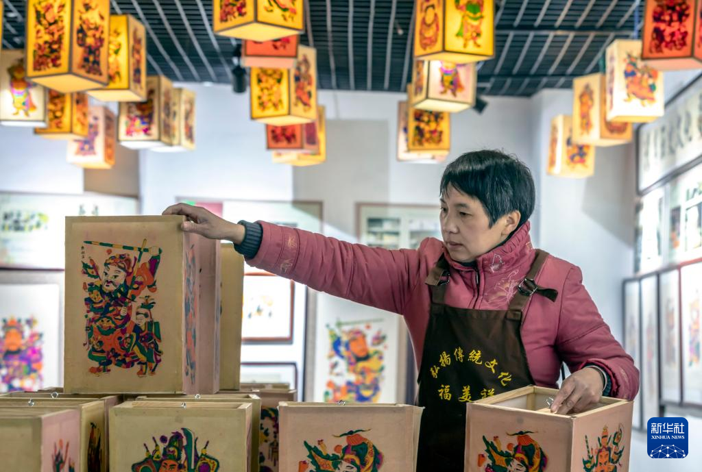 1月17日,在灘頭鎮(zhèn)福美祥年畫作坊,年畫藝人尹冬香在整理年畫制成的燈籠。