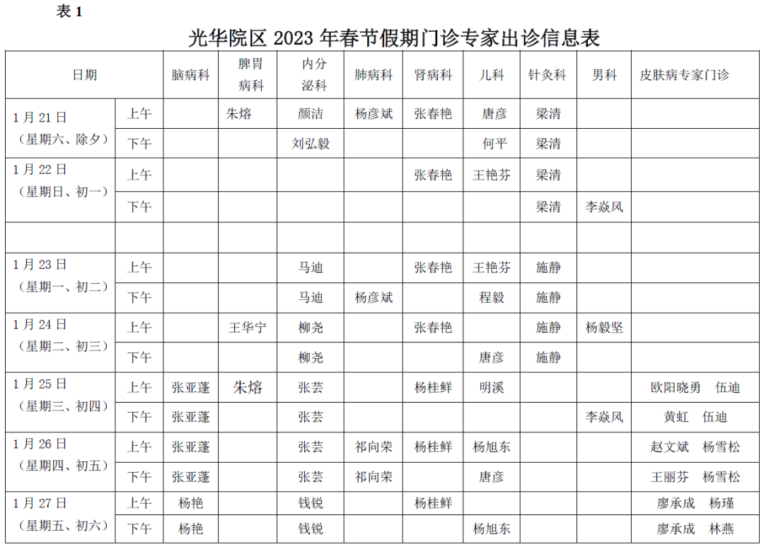 附件:光華院區(qū)(表1)、滇池院區(qū)(表2)春節(jié)假期門診專家出診信息表