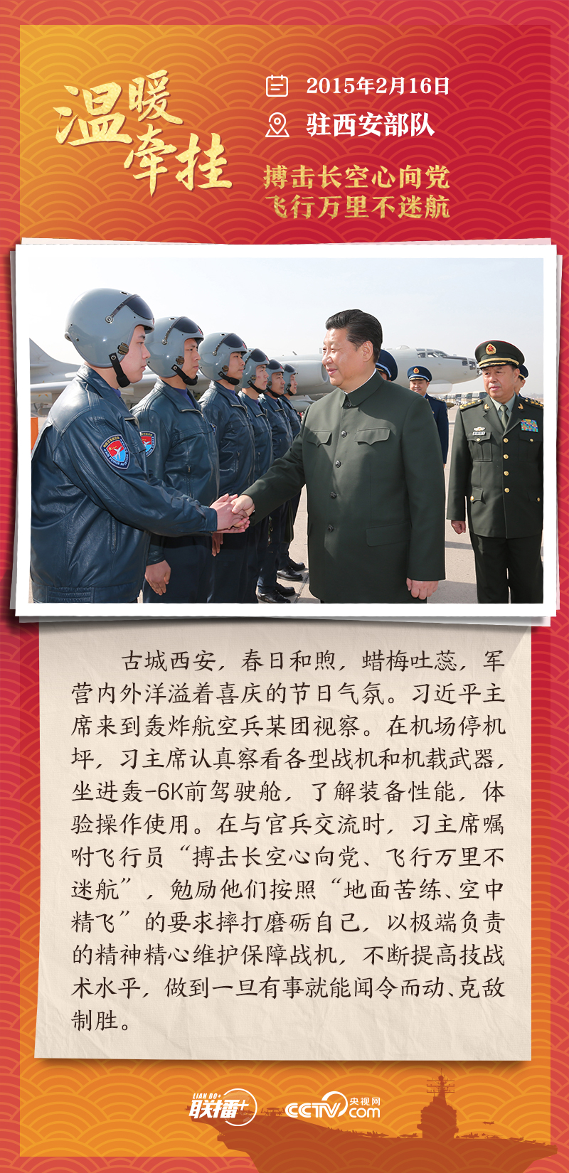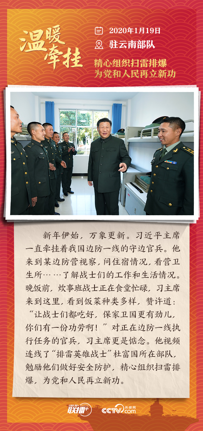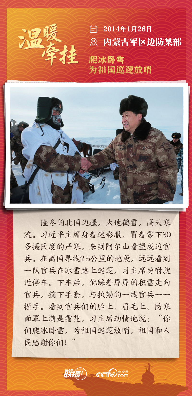 聯(lián)播+踏邊關(guān)、走戈壁、入班排、看哨所……黨的十八大以來(lái),每逢新春佳節(jié)到來(lái)之際,即使行程再滿,習(xí)近平主席也會(huì)留出時(shí)間來(lái)到軍營(yíng)、訓(xùn)練場(chǎng)或邊防線,看望或親切接見(jiàn)駐地部隊(duì)官兵,代表黨中央和中央軍委,向全體人民解放軍指戰(zhàn)員、武警部隊(duì)官兵、民兵預(yù)備役人員致以誠(chéng)摯問(wèn)候和新春祝福。