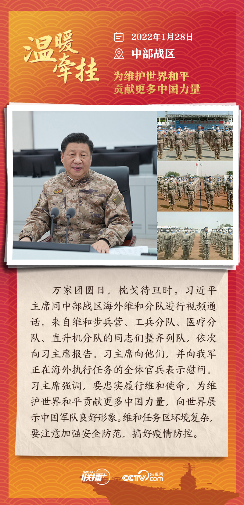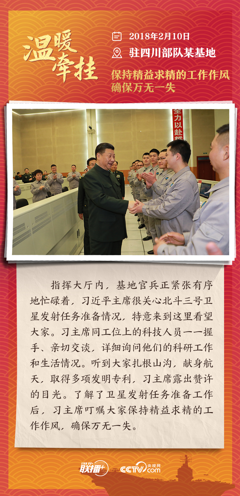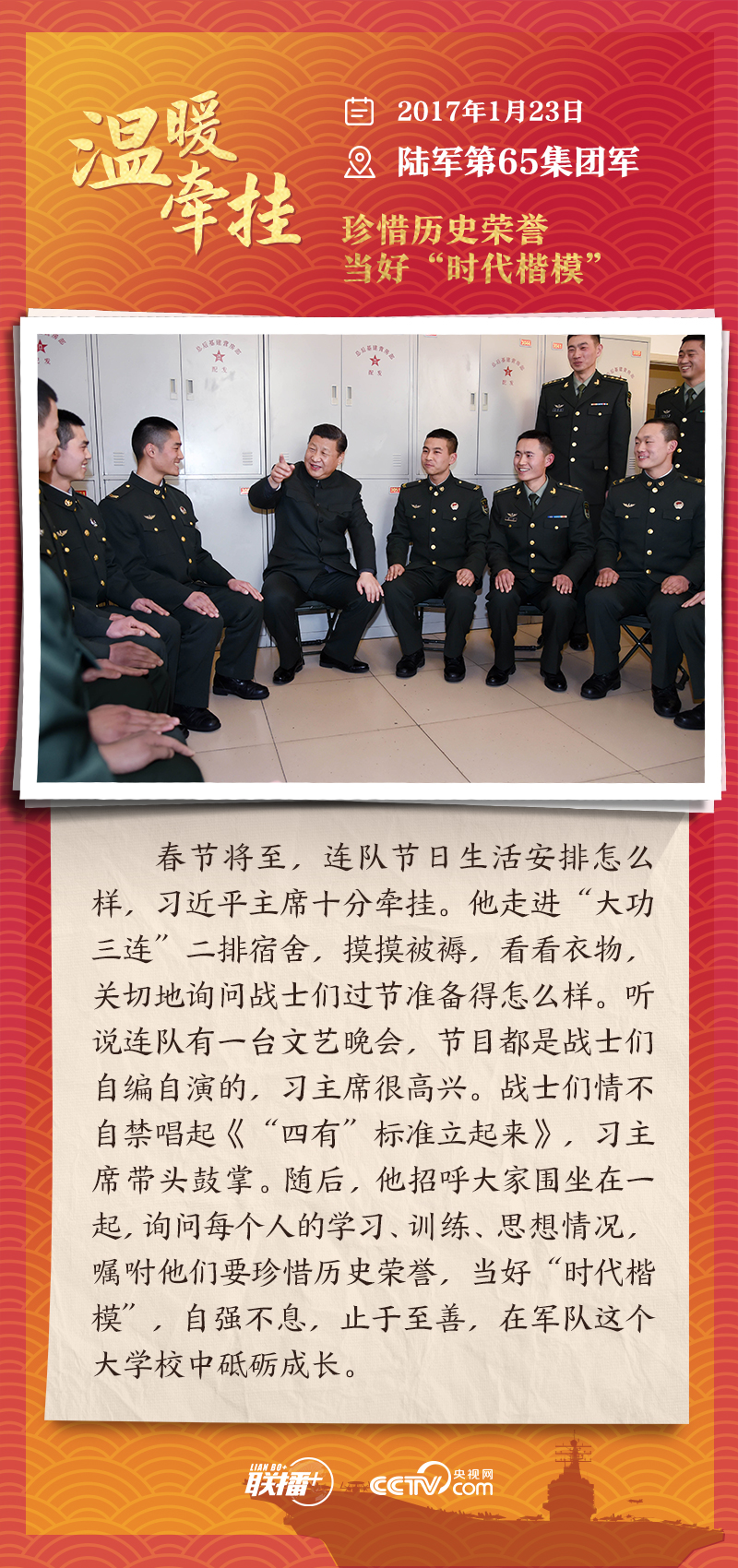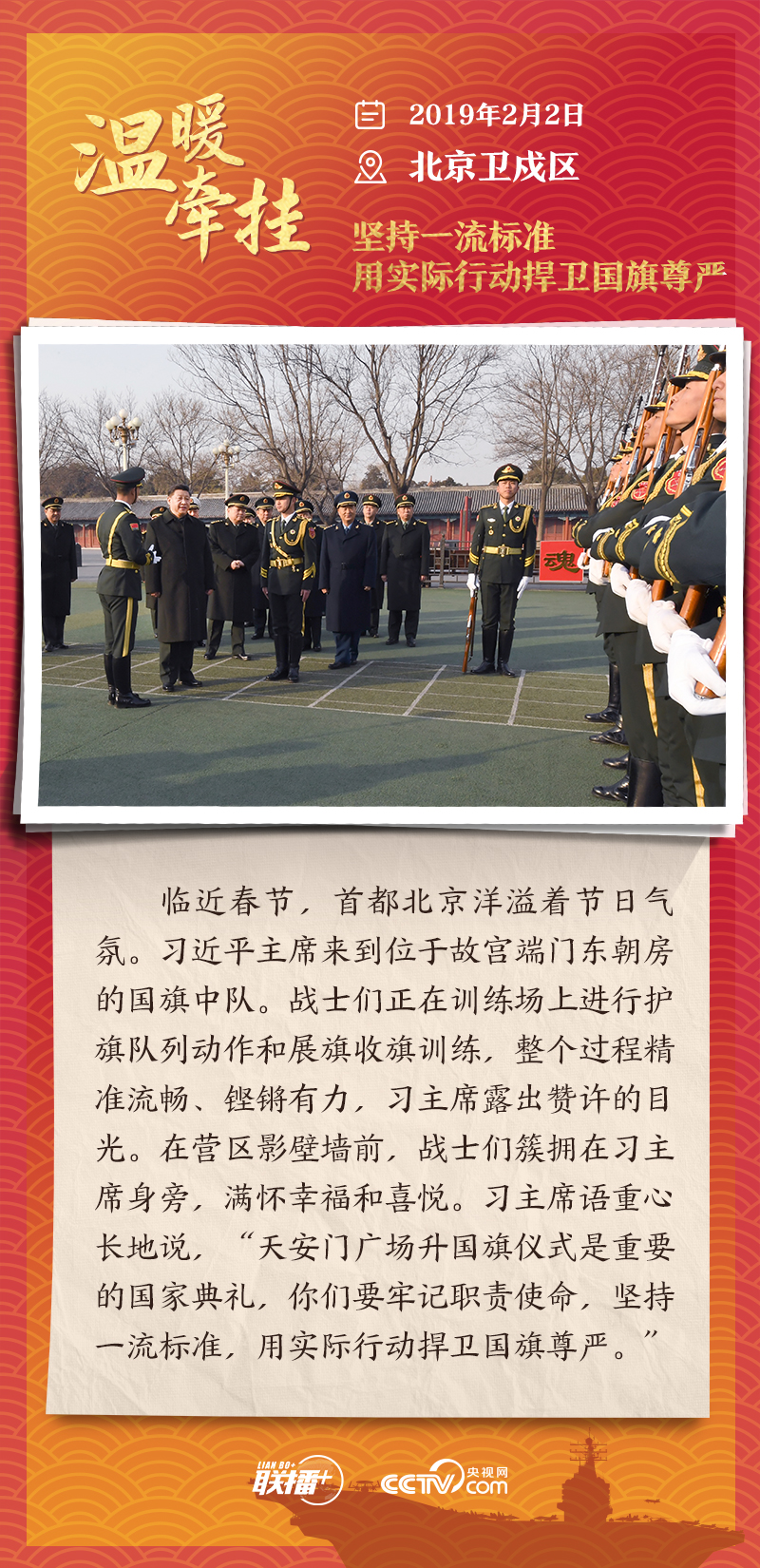 聯(lián)播+踏邊關(guān)、走戈壁、入班排、看哨所……黨的十八大以來(lái),每逢新春佳節(jié)到來(lái)之際,即使行程再滿,習(xí)近平主席也會(huì)留出時(shí)間來(lái)到軍營(yíng)、訓(xùn)練場(chǎng)或邊防線,看望或親切接見(jiàn)駐地部隊(duì)官兵,代表黨中央和中央軍委,向全體人民解放軍指戰(zhàn)員、武警部隊(duì)官兵、民兵預(yù)備役人員致以誠(chéng)摯問(wèn)候和新春祝福。